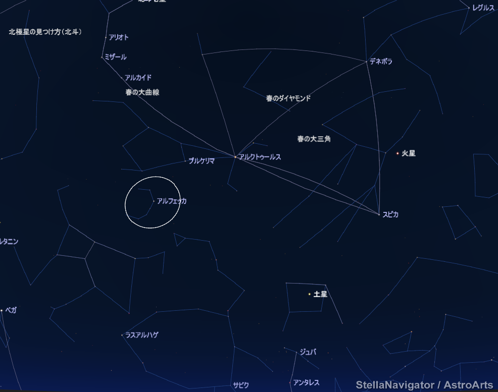 (星空案内)★大阪市20時★今日はやや曇り。マークをつけた部分、かんむり座のα星、アルフェッカ(「欠けた皿」)(ゲンマ(「宝石」))は2等星。