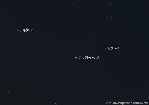 【9pm】空が澄んだ日は1等星以外の星もどんどん目に入ってきます。ほぼ頭上にはうしかい座のアルクトゥールス。腕を伸ばして指の幅2本分離れたところにはムフリッド、そしてプリケリマもはっきり。