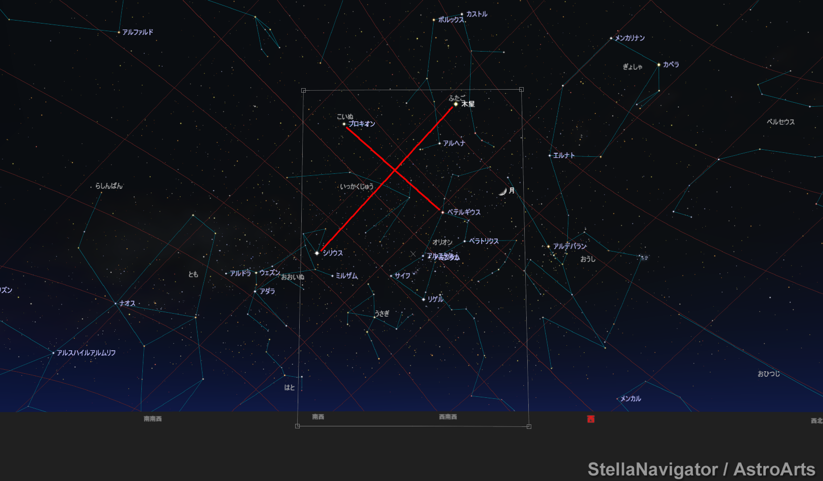 ふたご座にいる木星と冬の大三角の3つの1等星がちょうど十字に見えます。これを「大十字」などと呼んでいます。
