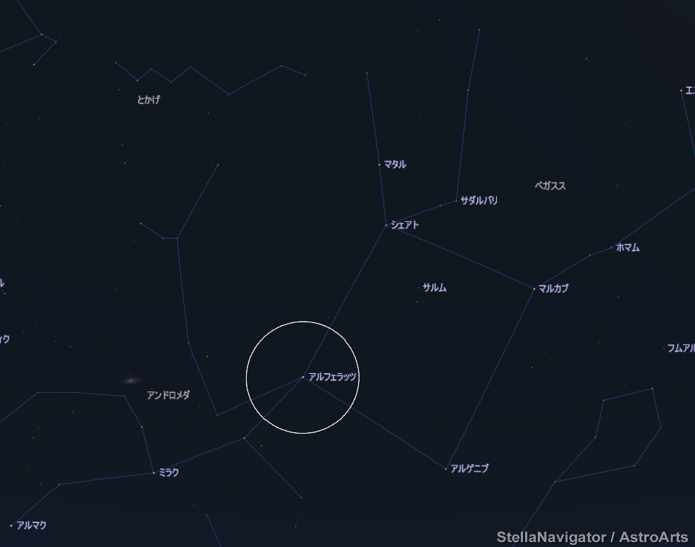 (星空案内/RT歓迎)本日22時の大阪市。もう秋の星座が見えます。ペガススの四辺形のうち、○の部分は唯一のアンドロメダ座のアルフェラッツ。