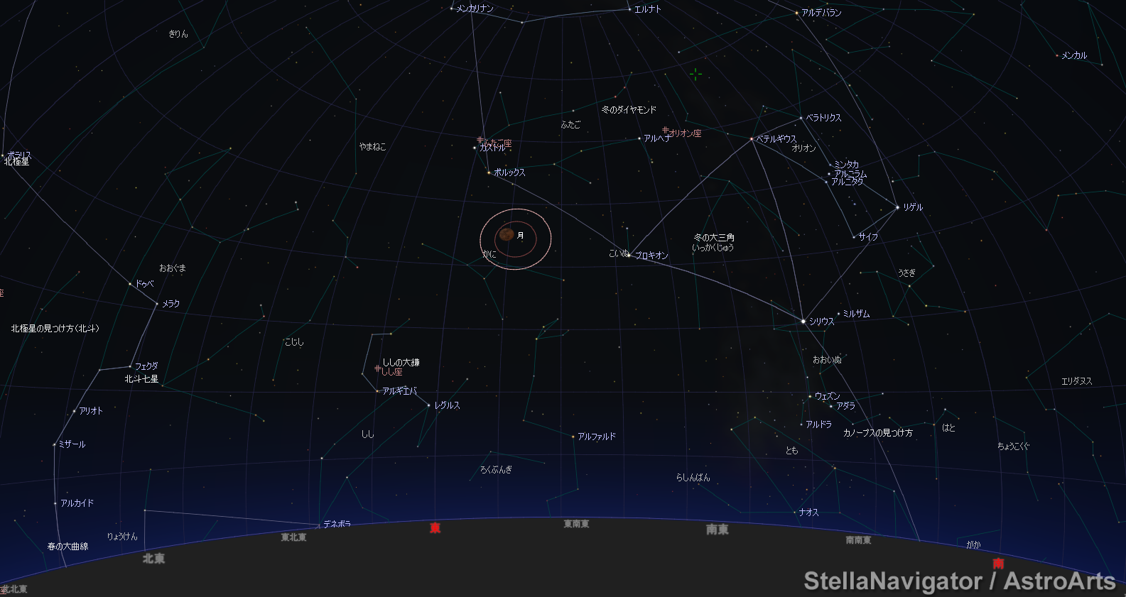 サンフランシスコ 2019/1/20 21:12頃 LST 皆既月食 (食の最大時間) 内側の丸枠が本影。外側の丸枠が半影。