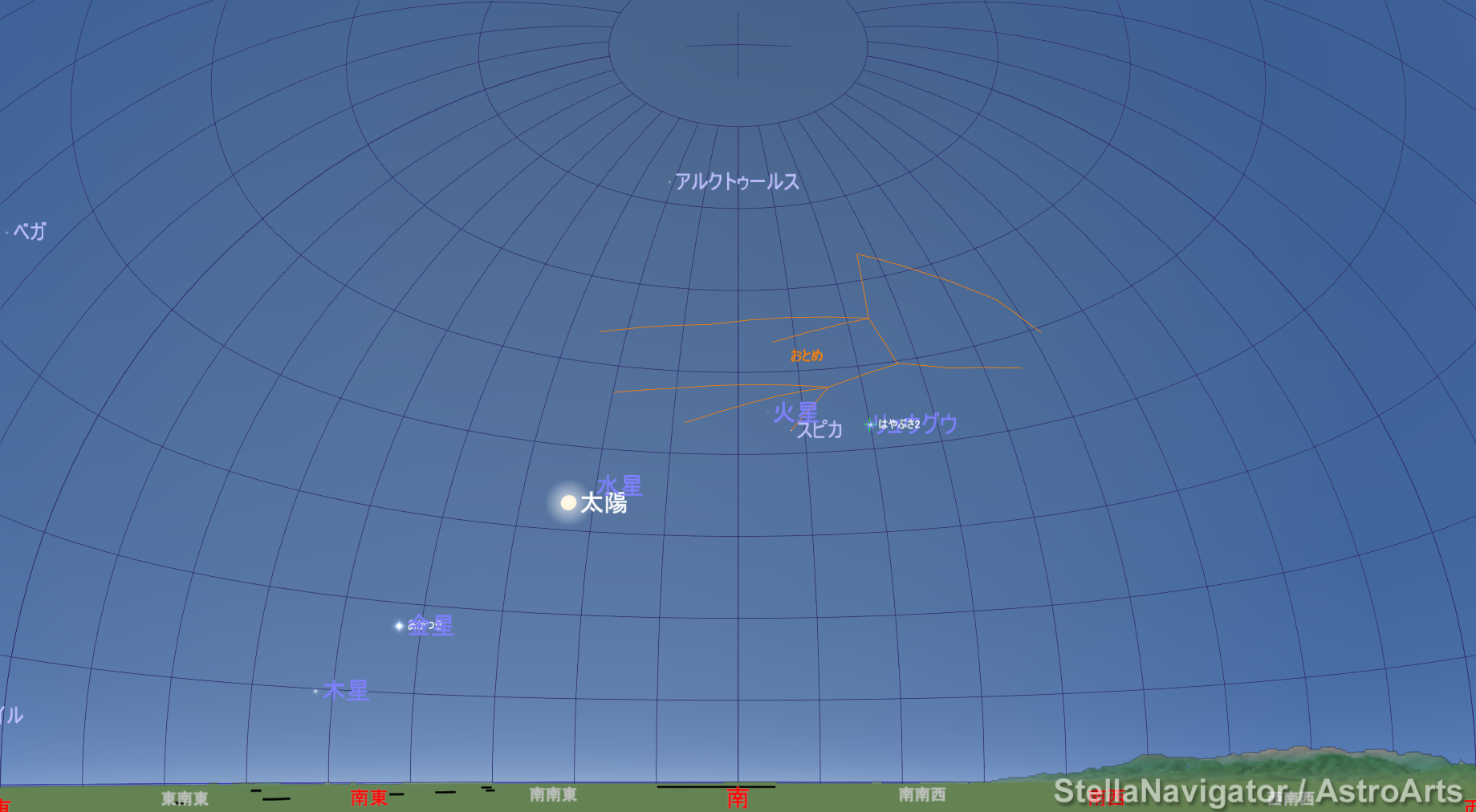 リュウグウ・はやぶさ2は太陽よりも西側にあり、太陽からの離角は約35°です。