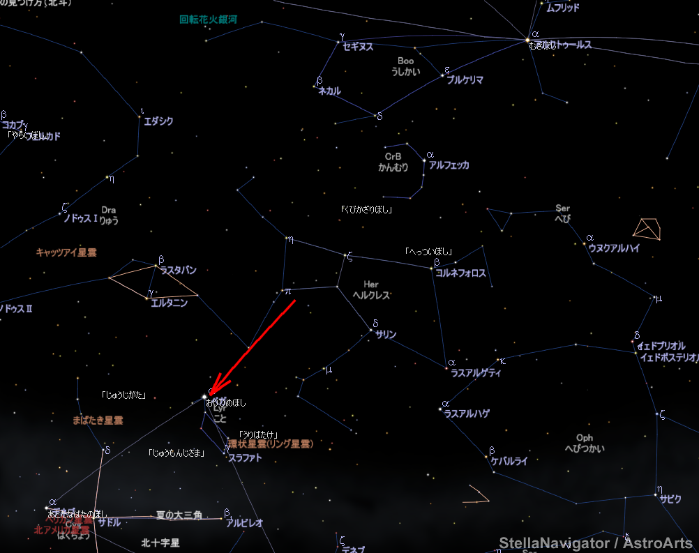 (星空案内:21時)今日はこと座のベガを。太陽を除き5番目に明るい恒星(0.00等星)。アークトゥルス(4番目)と並び、かなり目立つ恒星です。