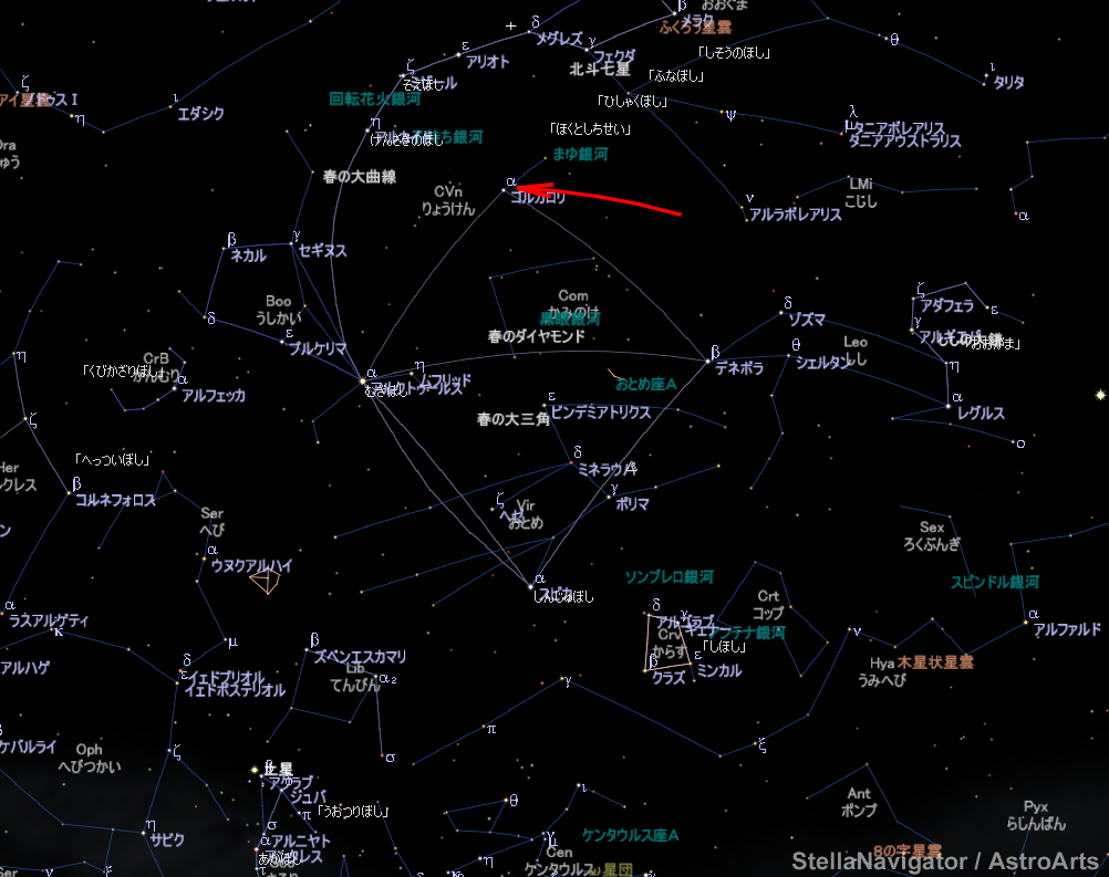 (星空案内:22時)今日はりょうけん座のコルカロリ(3等星)を。ヘベリウスが設定した星座。α星は3等星の割に見やすい恒星。春のダイヤモンドを形成。