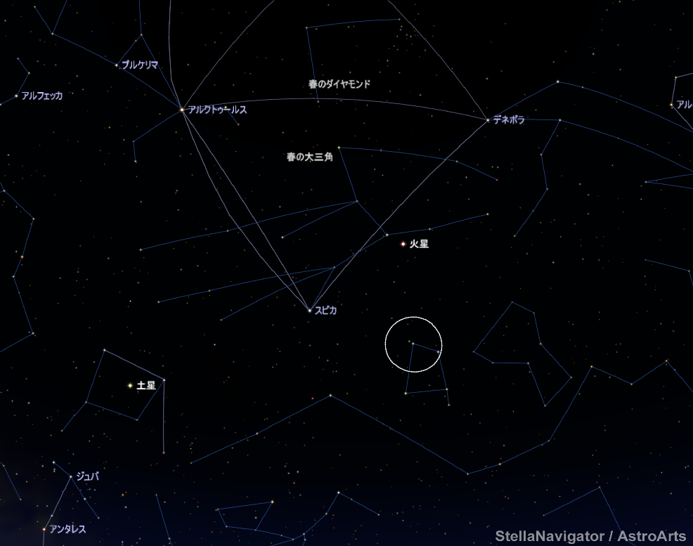 (星空案内)★大阪市21時★ 5/23はからす座の20時南中。春の大曲線をスピカ側に伸ばすと、からす座(α星アルキバ)のδ星、アルゴラブ(3.1等星)に出会います。