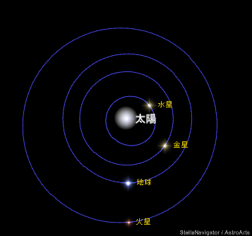 今日9日、火星が「衝」を迎えます。太陽~地球~火星が一直線。