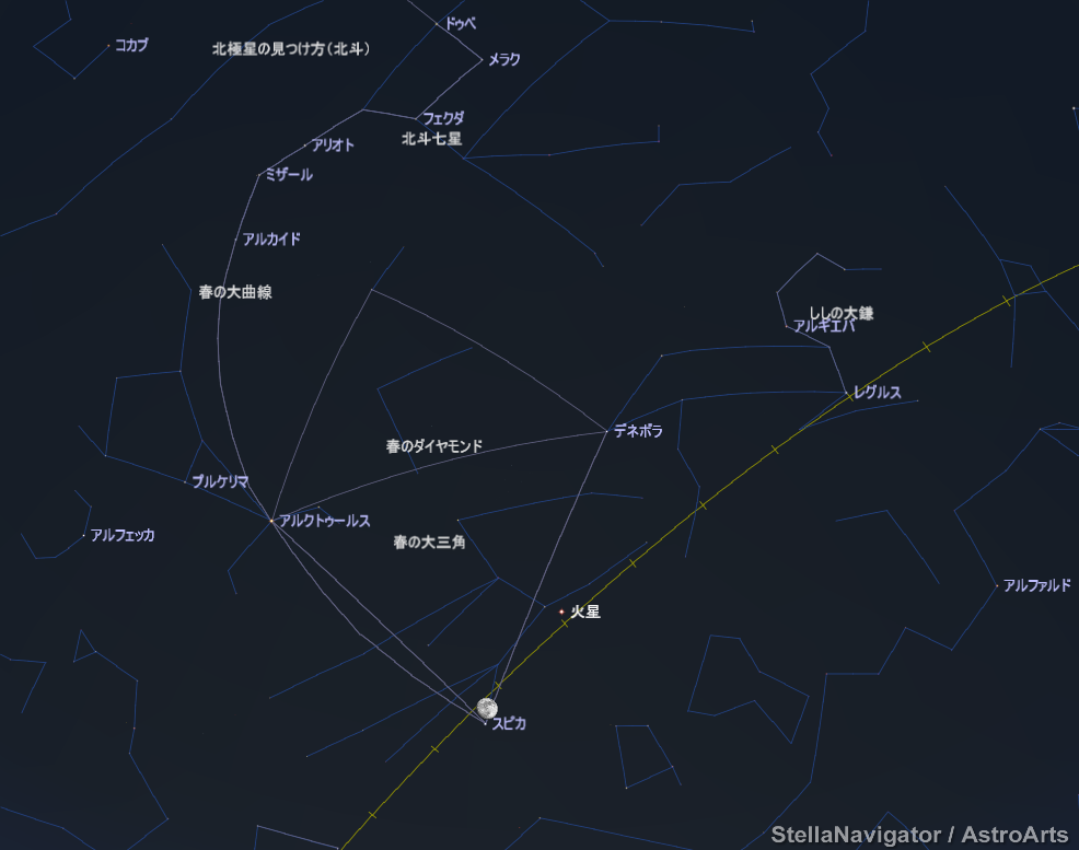 (管理人モード)本日20時の大阪市の星空(でも今日は雨…)。お月様とスピカが近くなります。さて、北斗七星を使ってレグルスを発見する方法があるのですが、知ってますか??