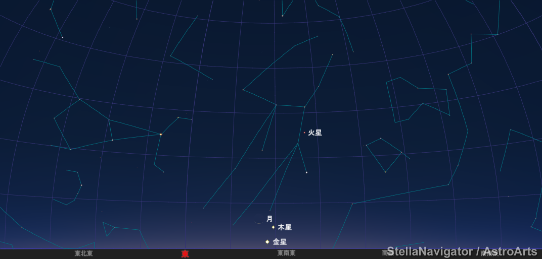 2017年11月17日早朝、東の低空で月、木星、金星が集合