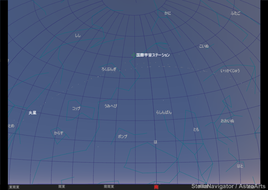 現地時間で 4/28 19:05 。実際にこう見えるかはお楽しみです。軌道要素がよく変わるので、事前にチェックが必要です。
