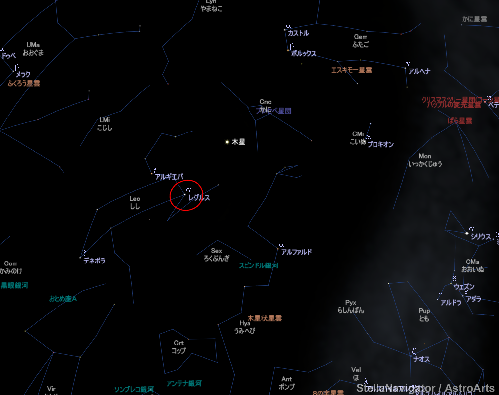 (星空案内::22時)今日はレグルス。「小さな王」のこの名前はコペルニクスが命名したといわれます。1等星の中で最も暗い1.4等星。しし座のα星。