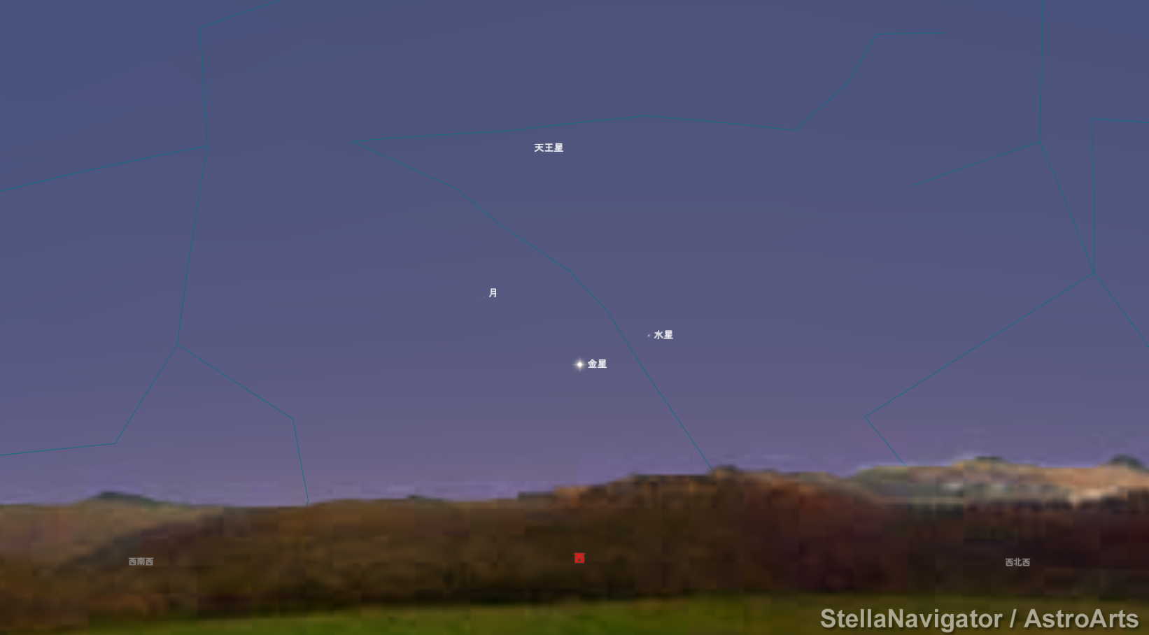 3/19(月)18時20分頃の空。金星水星に月が加わり賑やかな夕暮れ。見えないだろうけど天王星も。