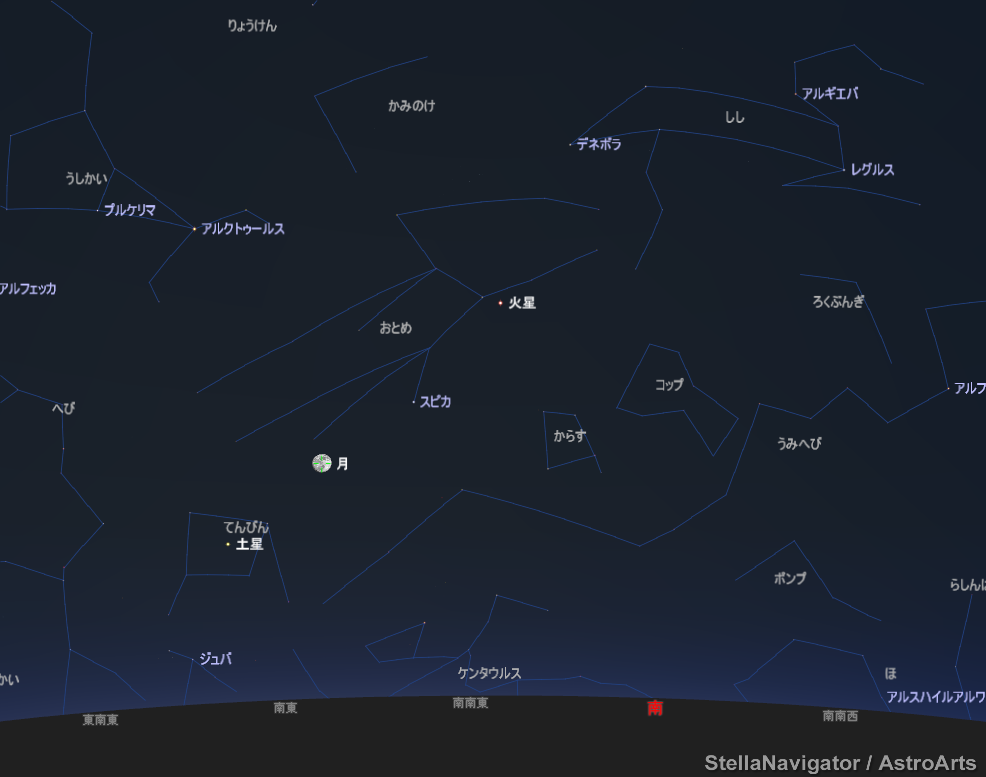(管理人モード/星空案内)20時の「山形市」の天気です。ちょっと北へ。お月様は15日に満月になります。土星に(みかけ上)接近中。山形市だとプリケルマも見えるかな?