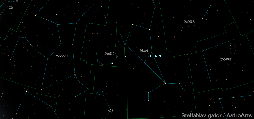 東京都の嶋邦博さん、2017年1月2日19時02分05秒(世界時)の観測から、うしかい座のNGC 5685銀河に17.7等の超新星を発見(SN 2017B)