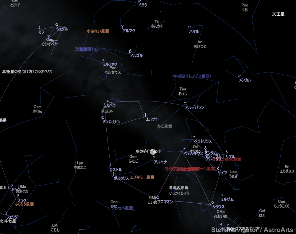 (星空案内:20時)今日は冬の星座が勢ぞろい。その中に満月のお月様が満月近く(月齢13.1)。1等星はいくつ見えるかな? #RTした方全員フォロー