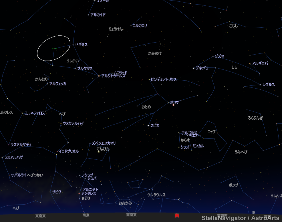 (星空案内)★大阪市21時★もう5月も20日近く。星空も夏の星座と交代。○で囲んだのはうしかい座のβ星、ネッカル(3.49等星)。β星の割に暗いんです。