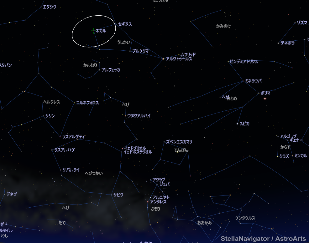 (星空案内)★大阪市21時★もう6月間近。春の星座とはお別れ。○の部分はうしかい座のβ星、ネカル(3等星/3.49等星)。ただしほかに2等星があります。