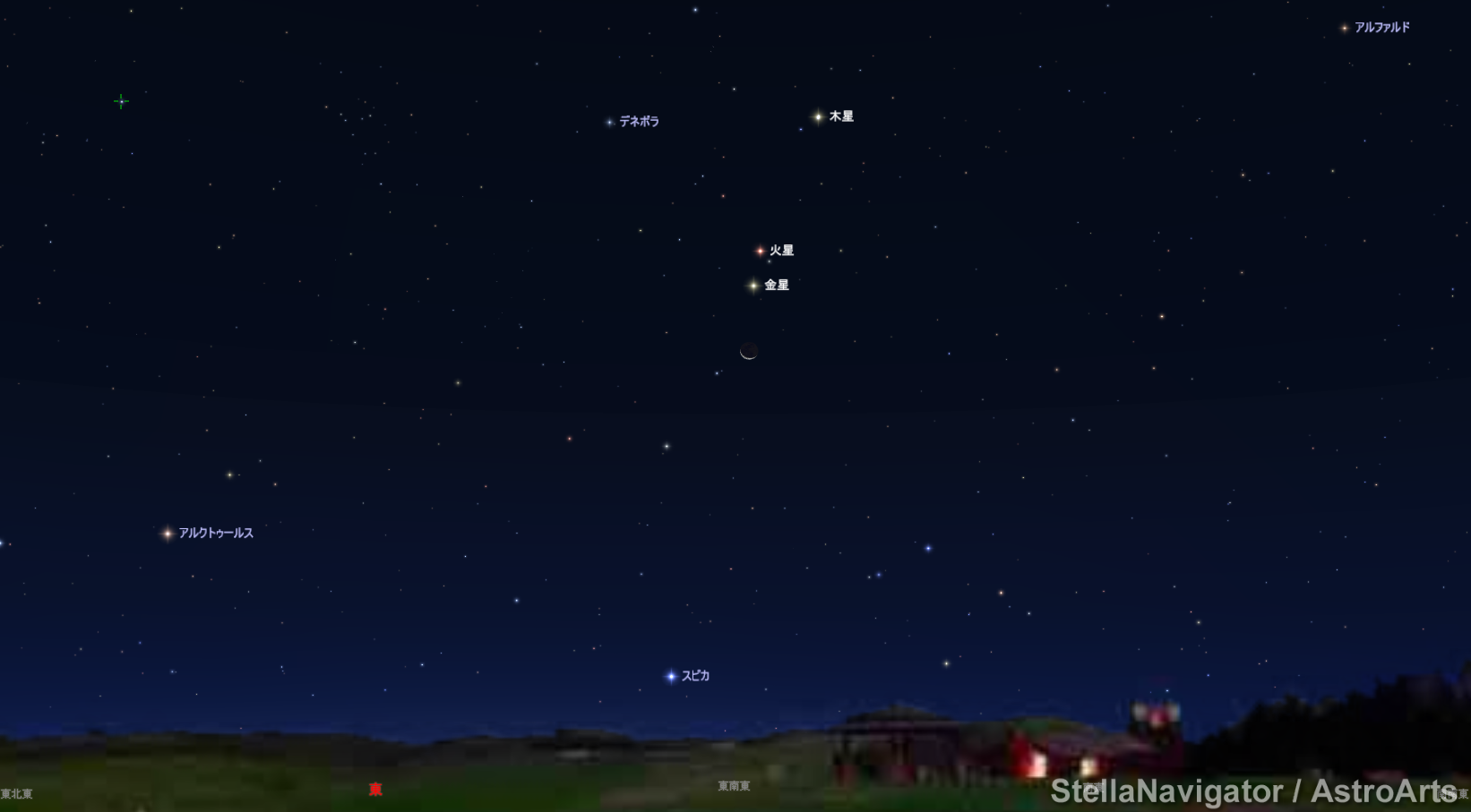 11/8(5時頃の空)夜明けの東の空に月・金星・火星・木星が並んでいます。月の出は2時半頃。見やすくなる4時頃の月の高度は15°薄明開始は4時半頃です(時刻は鹿角平の値)