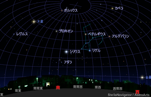 今日13日(金)19時半ごろの星空。冬の大三角もまだまだ見えます。
