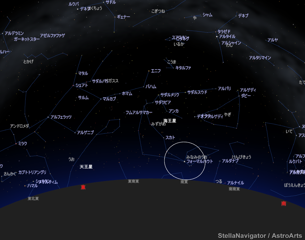 (星空案内/23時/リツイート大歓迎)23時には秋の星座が。秋の唯一一等星フォーマルハウトが見えます。ロイヤルスターとして古代から重要な星。