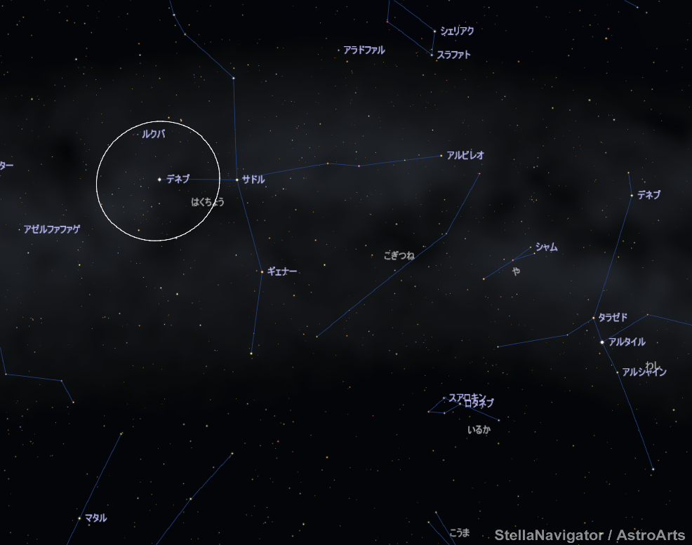 (星空案内/23時) もう8月。春の星座はシーズンオフになりつつあります。○で囲んだ1等星デネブは遥か1400光年向こうにある遠いお星さまです。