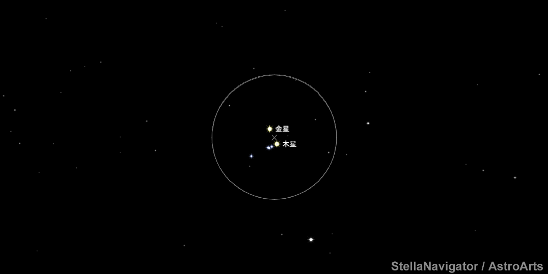 2016年8月28日7時半ごろ。木星と金星が、見かけ上ガリレオ衛星の広がりよりも接近。