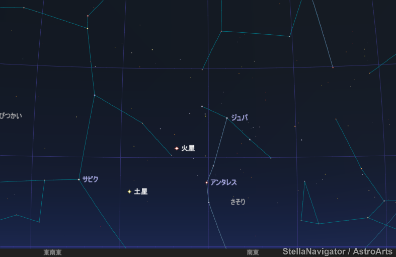 2016/04/17 22:35頃 赤さを競うように、火星とアンタレス☆ そして、近くに土星も☆