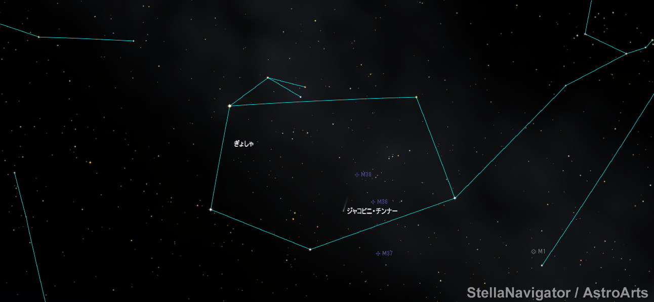 ジャコビニ・チンナー彗星が、ぎょしゃ座の散開星団と並ぶ。2018年9月9日2:00