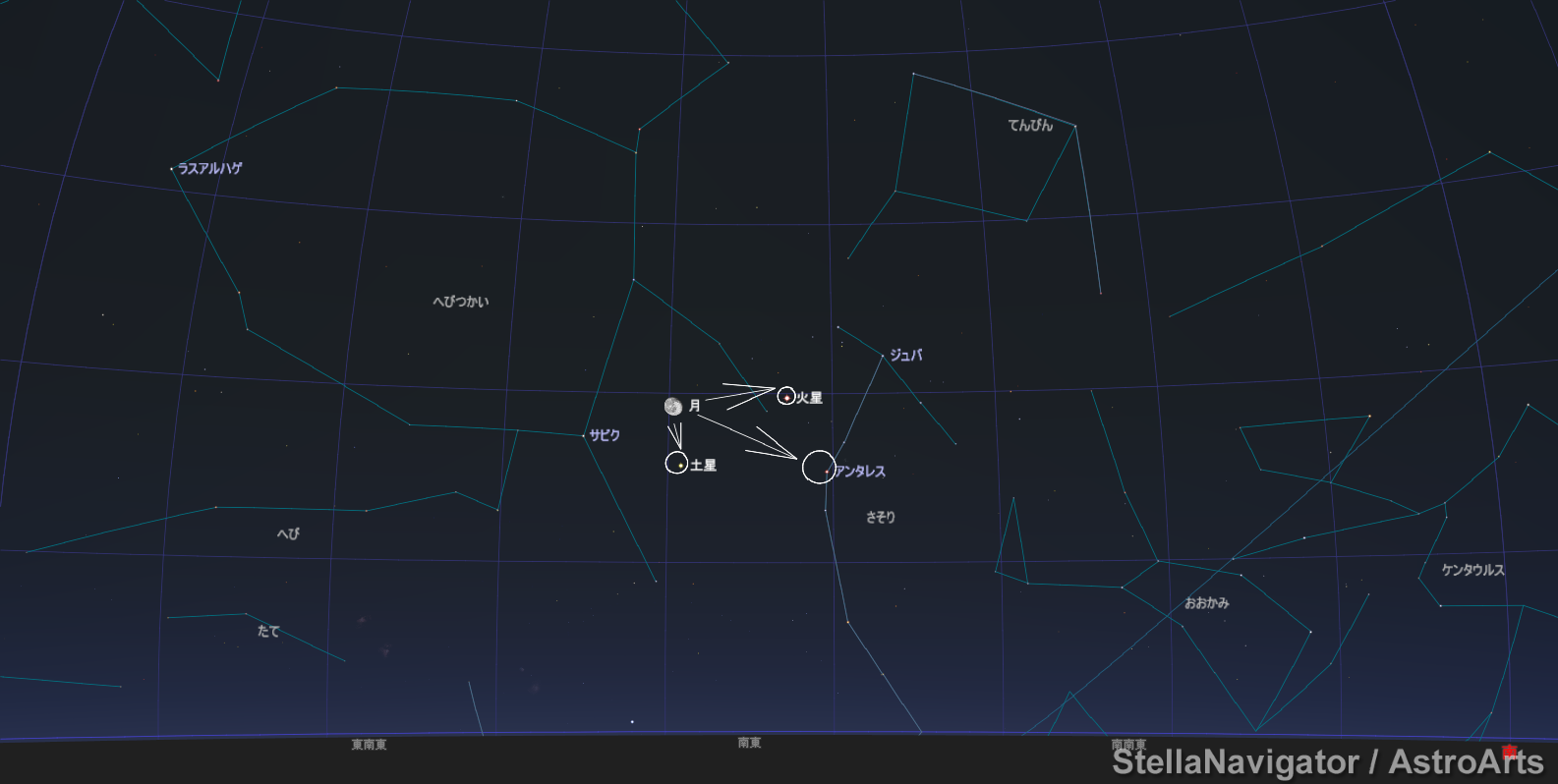 2016/04/25 23:00頃南東の空 月明かりがあるけれど、お月様を目印にして星探しをしたい。お月様から、火星、土星。蠍座のアンタレスを探すことが出来そう。火星とアンタレスの赤さもチェック(、・ω・)、 ☆