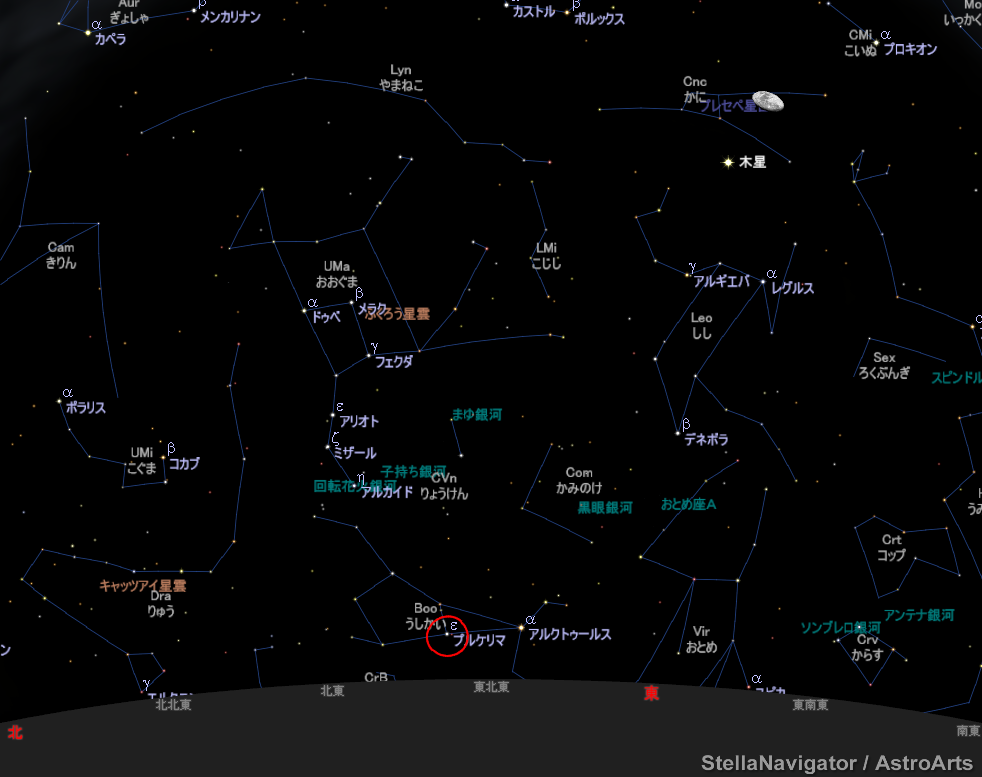 (星空案内、21時)今日はプルケリマを。うしかい座の2等星です。きれいな連星であることから、「最も美しいもの」を持つ今の名前が出来ました。別名イザール。