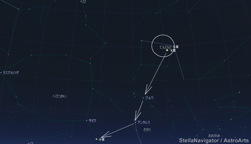 2018/01/04 5:30頃 木星が明るく輝いているので、そこから蠍座のジュバ→アンタレス→水星。と辿っています。木星の右上には、赤く輝く火星も見えます。