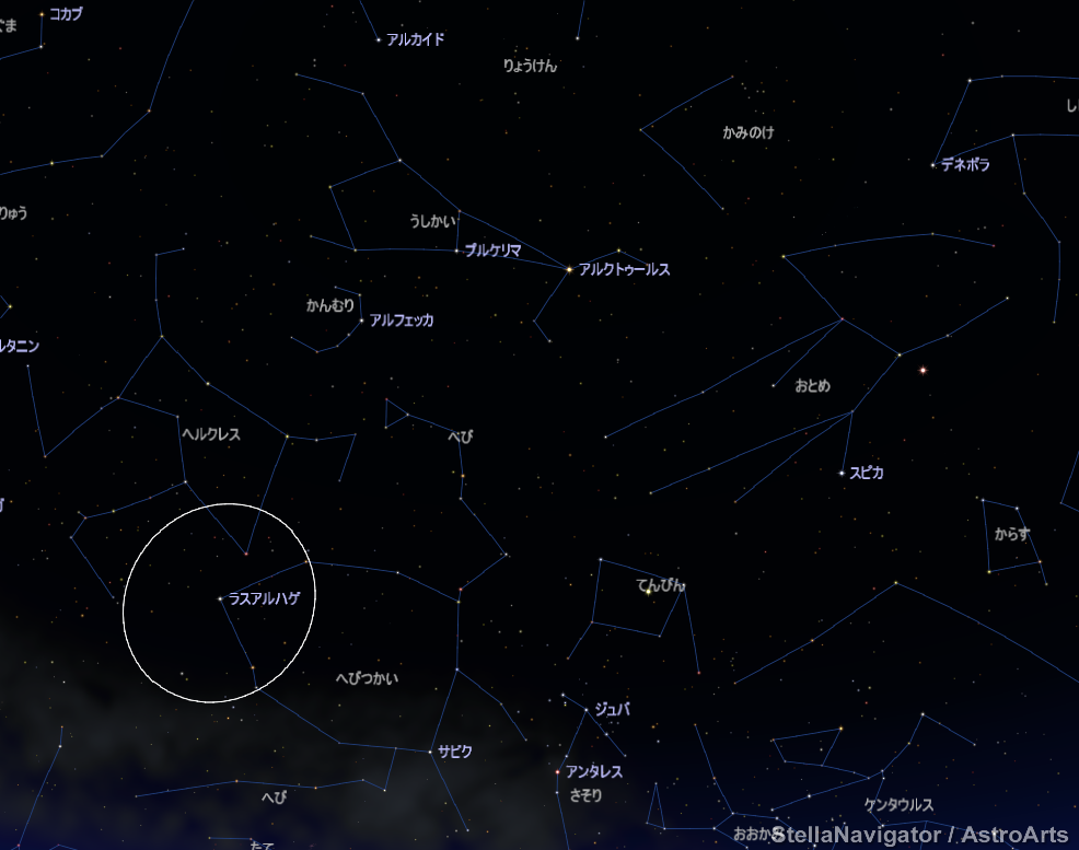 (星空案内)★大阪市21時★今日はくもりで星空が…。○印をつけたのは、"13"星座占いで脚光をあびたへびつかい座のα星。2等星です。そろそろ夏ですね。