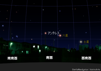 【16日19時半】南西の空に2つの赤い星、火星とアンタレスが並んでいます。28日に最接近 http://www.astroarts.co.jp/alacarte/2014/09/21/