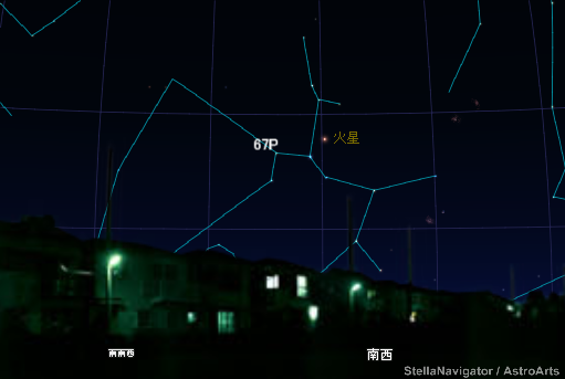 【12日18時】チュリュモフゲラシメンコ彗星はいて座方向に。いま南西に見えている火星のそばです。
