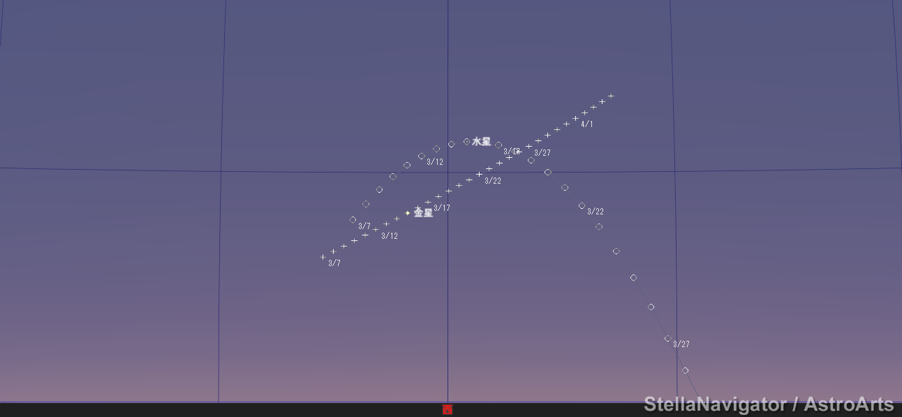 2018年3月、水星と金星の動き(兵庫県明石市、日没30分後の空)