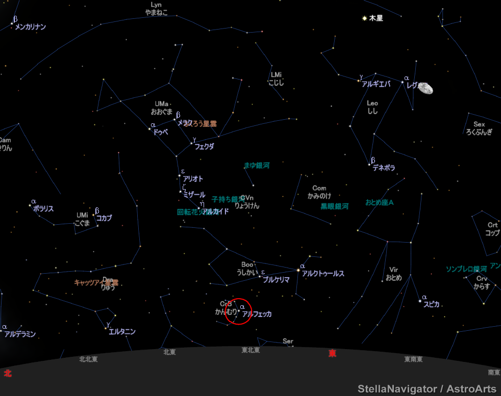 (星空案内:22時)今日はアルフェッカ(ゲンマ)を。かんむり座のα星で2等星。比較的小さな星座です。もうスピカも見えやすい時期になりました。