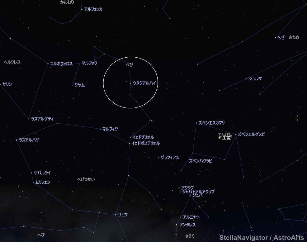 (星空案内★21時大阪市★)今日から6月。春の星座はまだまだ見頃ですが夏の星座も昇りつつあります。囲った部分はへび座。α星はウヌクアルハイ(3等星)。