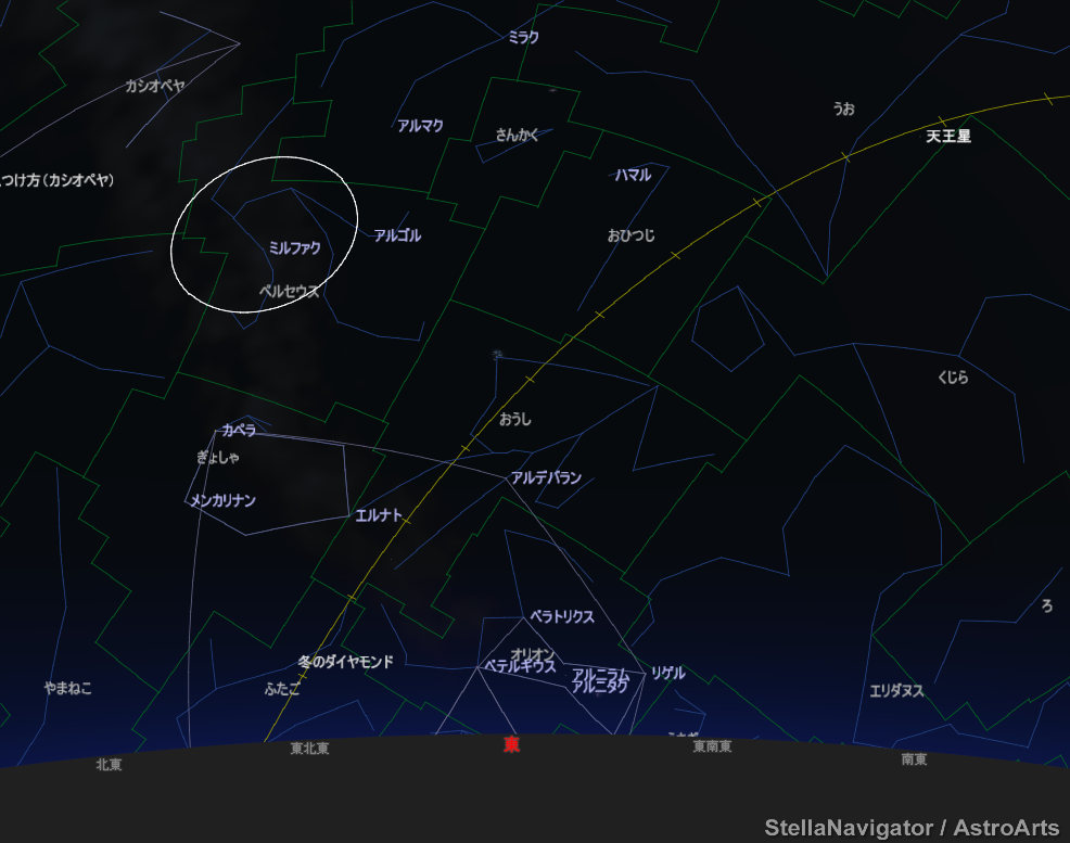 (星空案内)大阪市20時。全天で6番目に明るいカペラを見つけてまっすぐ真上をみると、2等星のミルファク(ペルセウス座α)が見つかります。