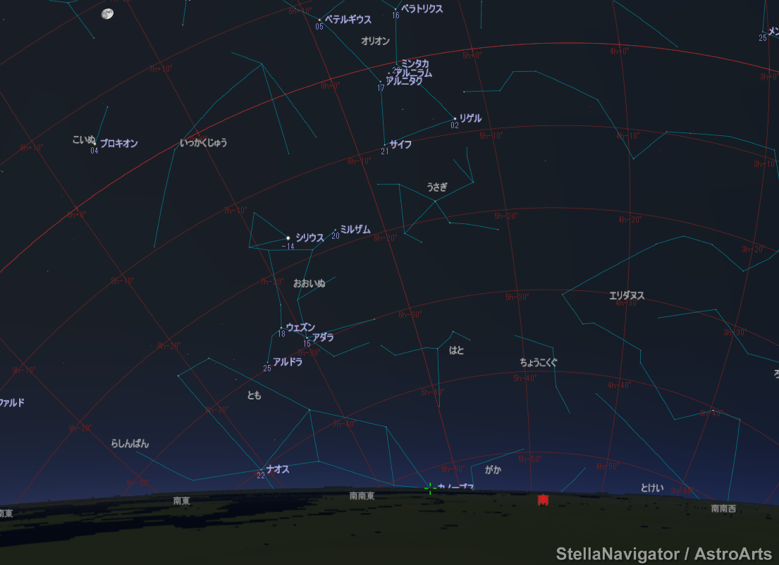 シリウスに次いで2番目に明るい-0.82等の赤い星カノープスが見つかるはず