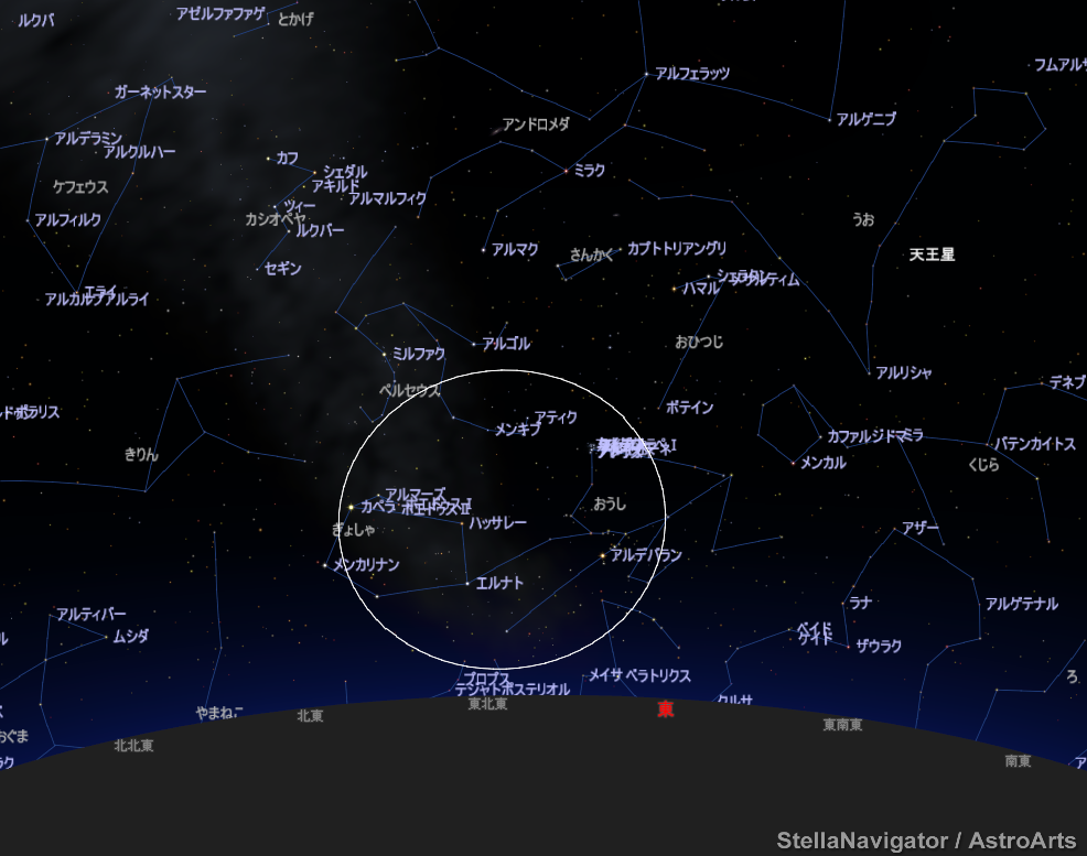 (星空案内)深夜3時ごろです。この時期になると冬の星座が昇ってきます。ひときわ明るいカペラとアルデバランが目立つはずです。