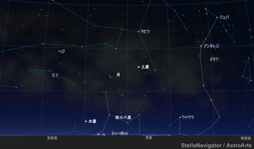 2017/01/25 5:39頃のアンタレス・土星・お月様・水星の位置