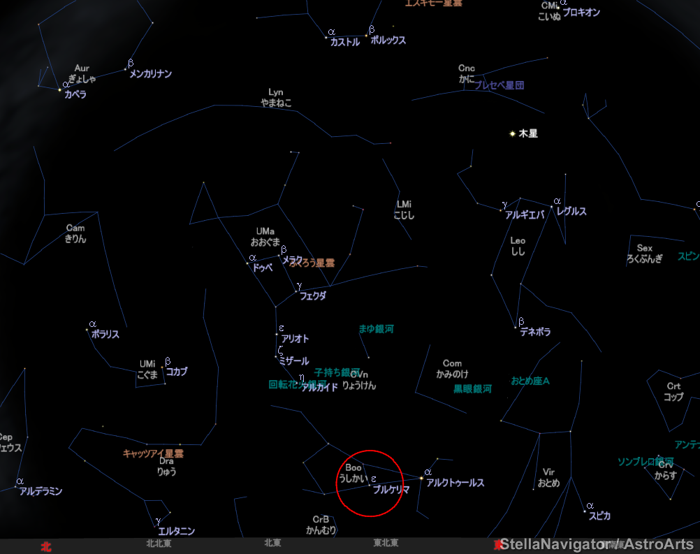 (星空案内、23時)今日はうしかい座のプルケリマ(2等)を。別名をイザール。この星は美しい連星であることから、「最も美しいもの」のラテン語がつきました。