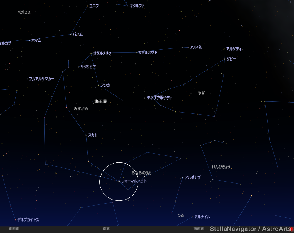 (星空案内・20時)今日はいい天気、南東に秋の星座で唯一の1等星、フォーマルハウトが見えますね。23時にはカペラ、アルデバランも見えます。