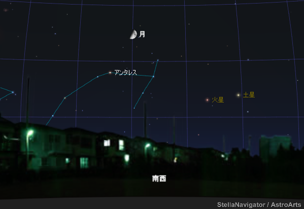 今日2日は上弦(じょうげん)の月。新月から満月までのちょうど中間です。そばの赤い星はさそり座のアンタレス。