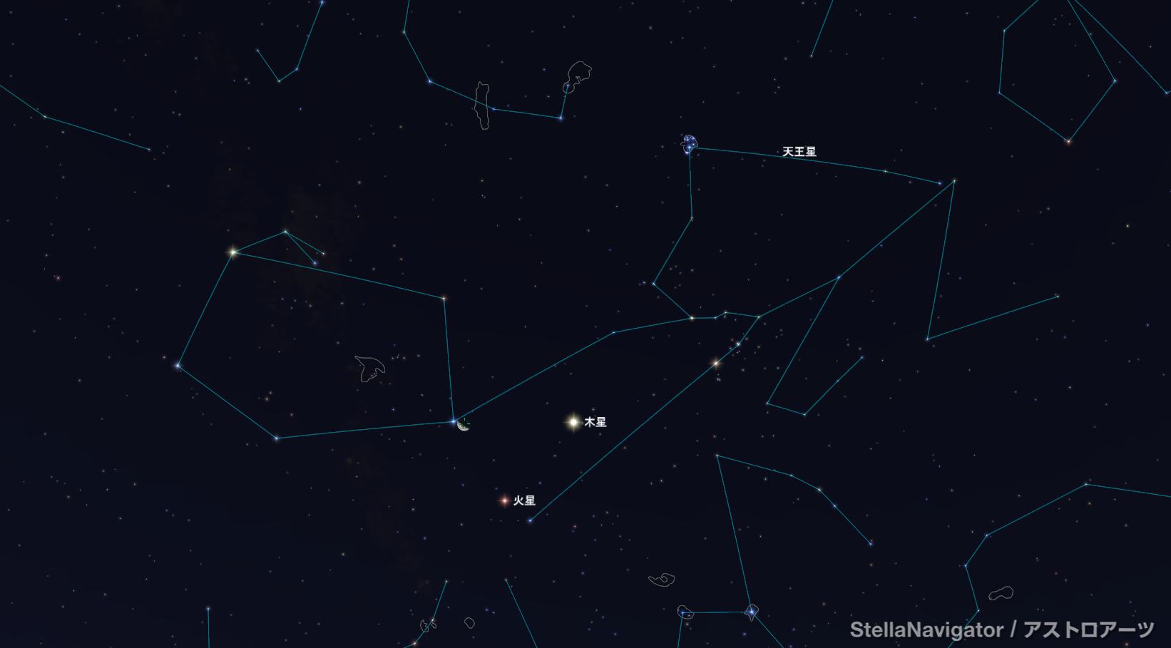 8月28日(水) 月と木星(約6°)・火星(月と約5°と木星と約6°)が並ぶ